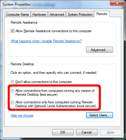 We are focusing our energy upon the last two options. Depending upon your environment and how you would like to authenticate to the network, you will have to select the correct option. However, in most cases (home/office) you will be selecting the first option that states: Allow remote connections from computers running any version of remote desktop (less secure).