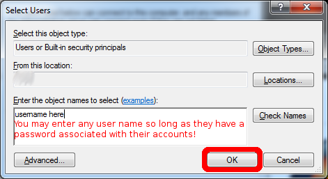 3) After we selected the select users option we will then proceed to selecting users. You can enter user names, or attempt to find users to which you would like to add to the listing. Please make sure the users do have passwords applied to their accounts; or RDP will not operate successfully!